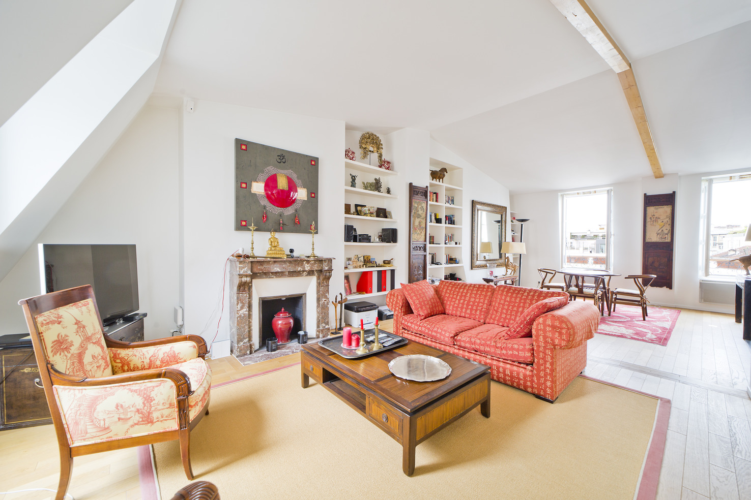 This air-conditioned apartment for sale in Paris on the 4th and 5th floors of a lovely mid-19th century building with elevator. The top floor two bed two bath duplex lies in a village-like residential neighborhood in Paris’ 16th district. Both the Bois de Boulogne and the Ranelagh Gardens are in walking distance.