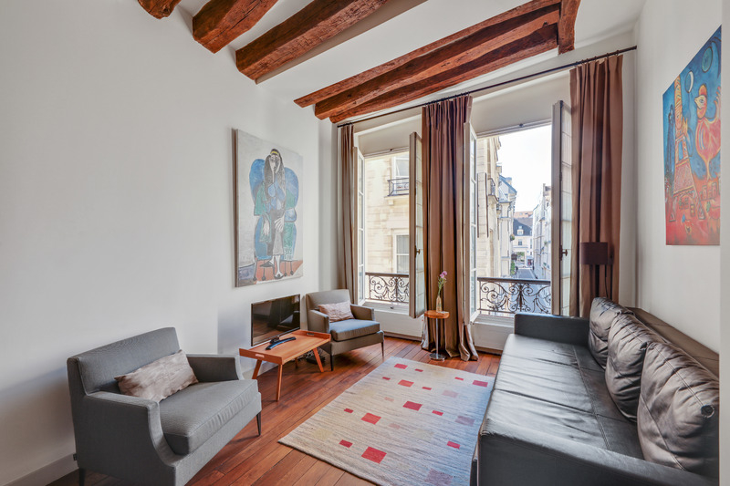 This air-conditioned Paris apartment occupies the 2nd and 3rd floors of a charming 17th century building without elevator on a quiet sunny street in Saint-Germain-des-Prés. In one of the most sought-after areas of Paris' 6th district, it lies between the Seine and the boulevard Saint Germain.