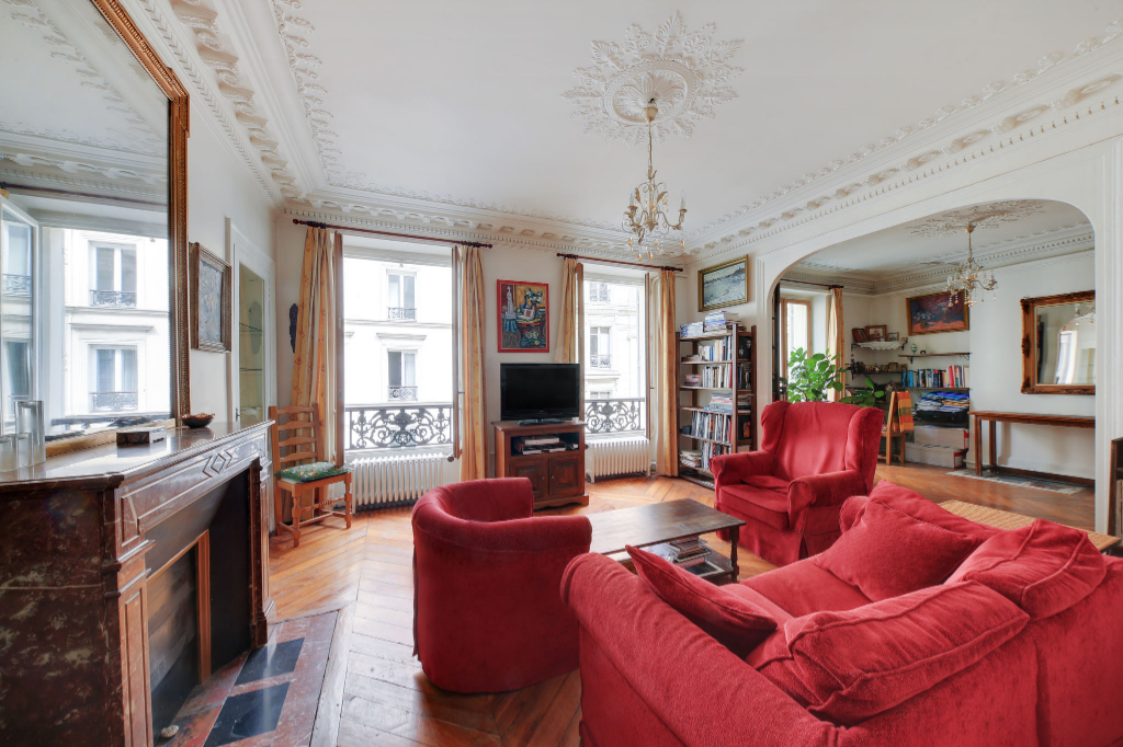 This Bastille Marché apartment lies between the renowned outdoor market and the Marais. The classic one (or two) bedroom sits on the second floor with elevator of a well-kept 19th century building. A practical entrance space opens to a large double living room. The apartment is decorated with beautiful original moldings, chevron parquet and a fireplace. In addition, three large windows overlook the street and make the space bright.