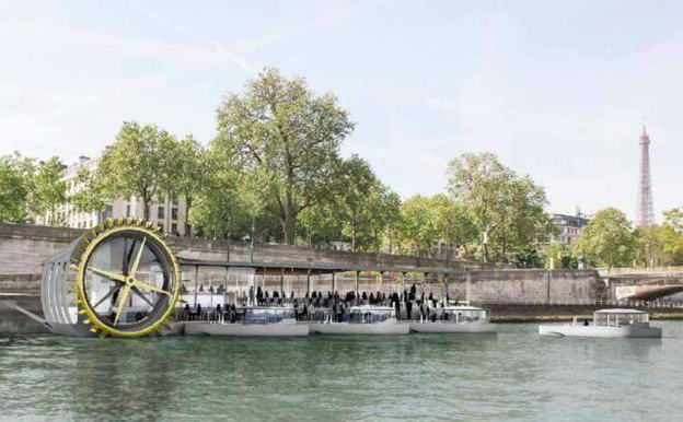 A large wheel will propel the boat, making it a real moulin (mill). Additionally, seminars will take place in the hold of the boat. Powered by electricity, the Moulin Seine is also a green project.