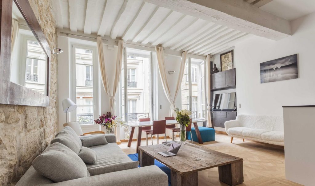 The apartment combines historical features with modern comforts. Beams, Versailles wood flooring and high ceilings are only a few of the characteristics that makes it special. A living/dining area exposes the original limestone wall and tall French windows. Adding to the charm, the fully equipped open kitchen offers high-end modern materials, along with a wine fridge. Furthermore, the bedroom and bathroom overlook a quiet courtyard.