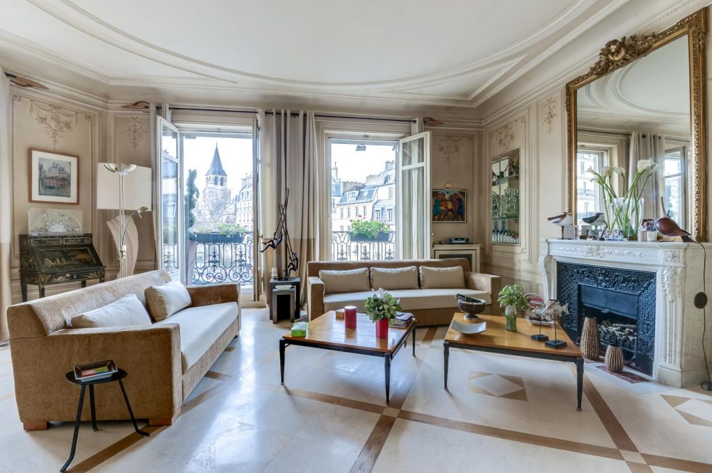 This 3 bedroom Paris apartment offers panoramic views of the Saint-Germain des Prés church and boulevard. The corner apartment is on the 3rd floor with elevator of a prestigious 19th century building. It is located in the sought after 6th district between the place Saint-Germain des Prés and the Odéon. The Marché Saint-Germain is just around the corner. It is a short stroll to the Seine, the place Saint-Sulpice and the Luxembourg gardens.