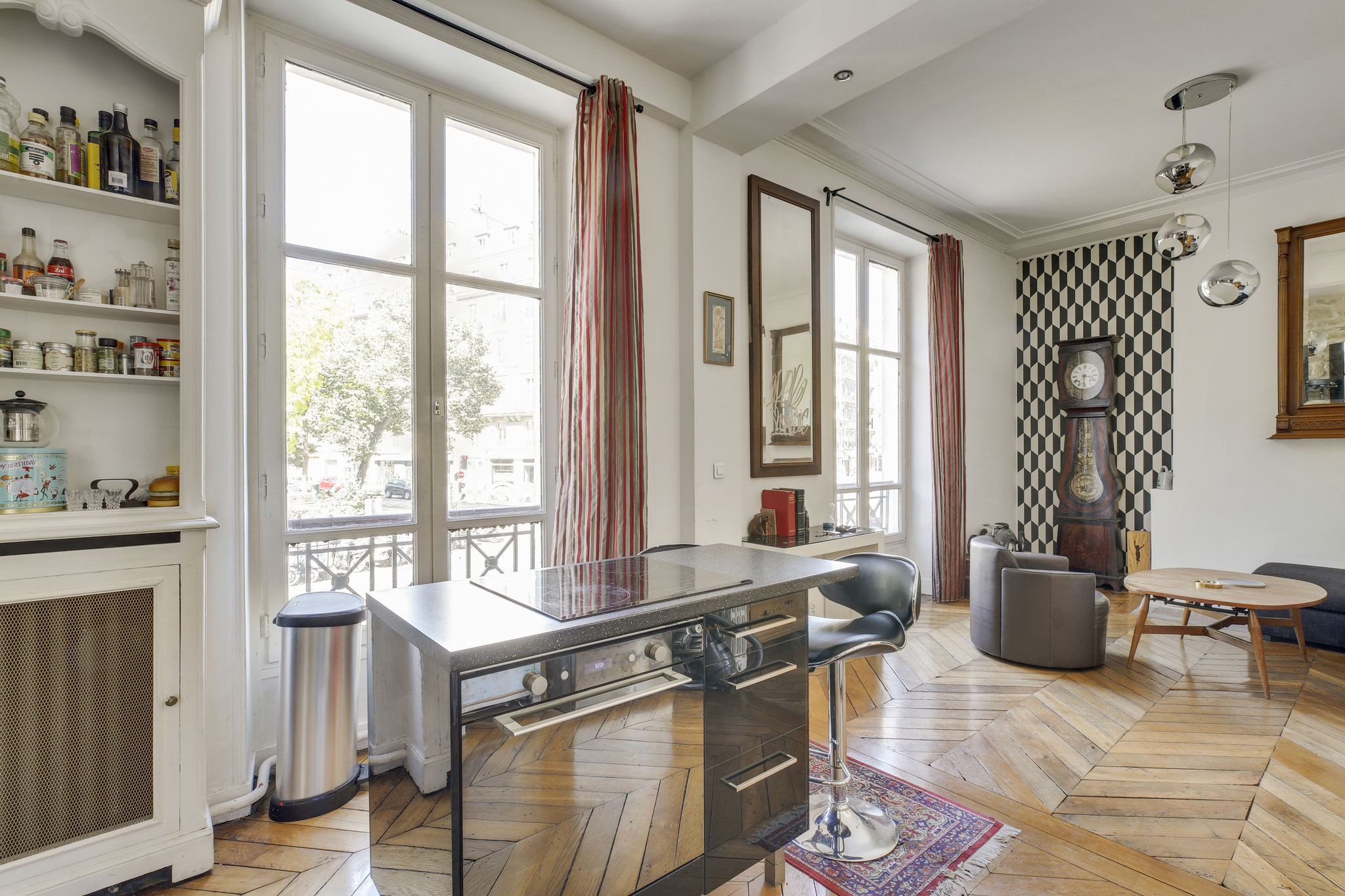 This Montholon Square apartment lies on the border of Paris’ trendy 9th and 10th districts. The spacious apartment sits on the 1st floor without elevator of a recently renovated pre-Haussmannian corner building. And it overlooks the leafy square below.