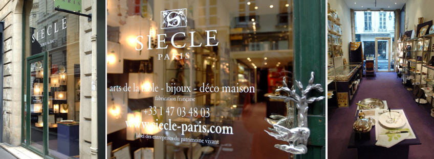 Siècle opened its doors in 1992. It displays its tableware (cutlery, porcelain, glasses, linen) and jewelry on two floors. Most of the pieces are handcrafted at a workshop located south of Fontainebleau in a little village in the département (county) of Seine-et-Marne.