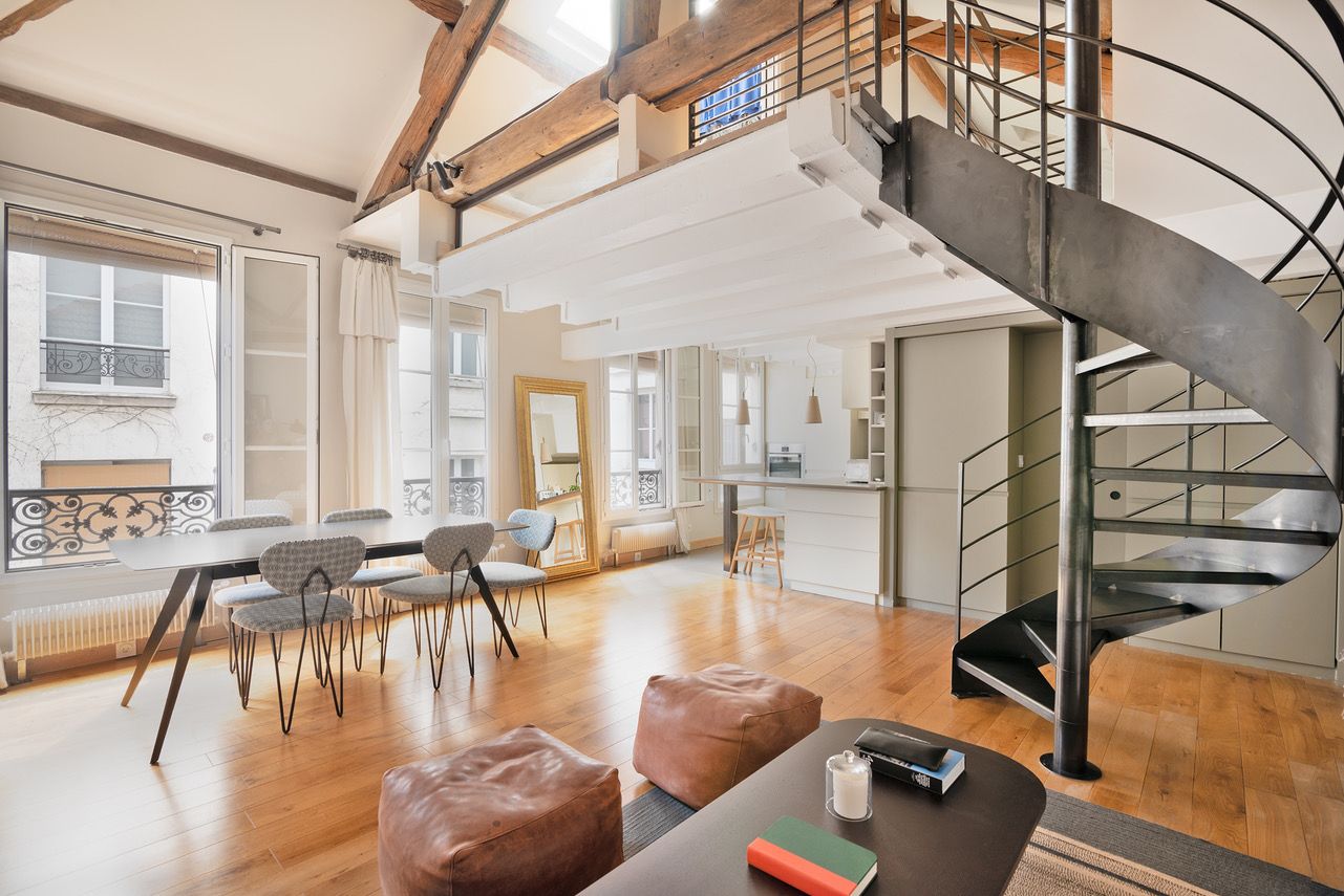 This air-conditioned top floor Marais apartment for sale is fully renovated. On the fourth floor without elevator of a period building, the one-bedroom duplex overlooks a quiet courtyard with greenery. In the heart of the Marais, Paris’ Carnavalet museum and the Place des Vosges are both nearby.