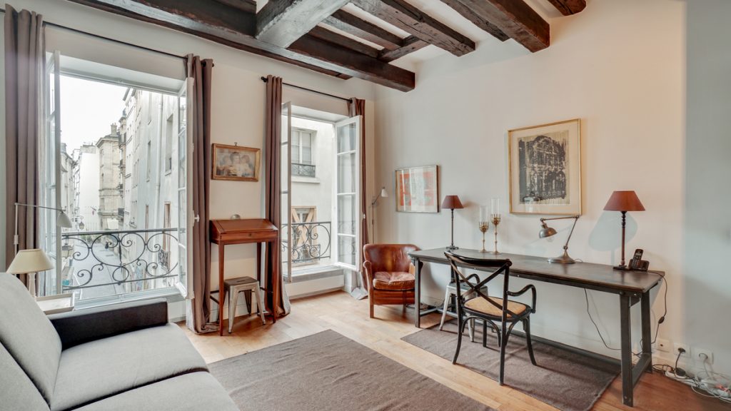 Two French windows overlook the charming perpendicular street. In addition, high ceilings and exposed beams add to its charm. Moreover, a built-in bookshelf adds to the cozy feel, while the floor to ceiling mirror enlarges the main room. And the 230 sq. ft. property offers a separate kitchenette with washing machine. Its folding doors hide it from view. The tiled bathroom includes a tub.